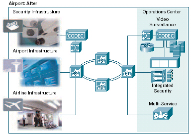 。。許多機(jī)場安全系統(tǒng)基于需人工協(xié)調(diào)提示和報(bào)警的不兼容應(yīng)用。通過在網(wǎng)絡(luò)上實(shí)現(xiàn)這些系統(tǒng)和在基于標(biāo)準(zhǔn)的通用基礎(chǔ)設(shè)施上傳輸信息,機(jī)場可實(shí)時(shí)關(guān)聯(lián)安全信息,并根據(jù)整體形勢作出立即行動(dòng)。思科提供了一個(gè)強(qiáng)大的網(wǎng)絡(luò)基礎(chǔ)設(shè)施,可集成機(jī)場中的視頻監(jiān)視、其它物理安全設(shè)備和用于緊急響應(yīng)及通信的設(shè)備。無論設(shè)備使用有線還是無線連接,都可在所有類型的設(shè)備上實(shí)現(xiàn)語音、視頻和數(shù)據(jù)交換。