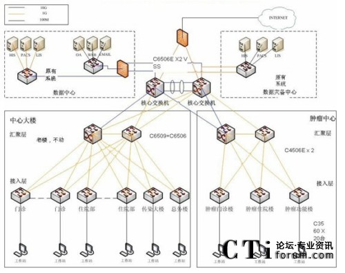 4506E作為新腫瘤大樓的匯聚層和整個醫(yī)院的小災(zāi)備中心,并上連至核心交換機以節(jié)約投資成本,而接入層繼續(xù)采用思科Catalyst 3560交換機,既方便了管理,也為日后無線網(wǎng)絡(luò)的部署作好了準(zhǔn)備。(網(wǎng)絡(luò)拓?fù)鋱D如下)