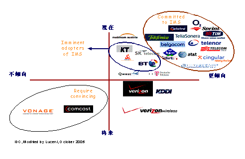 朗訊IMS融合解決方案的優(yōu)勢決定了其市場的領(lǐng)導(dǎo)地位,截至2006年24月,朗訊在全球已簽約77個(gè)IMS商用合同和77個(gè)試驗(yàn)合同。尤其是北美五大運(yùn)營商(Cingular、Sprint、at&t、BellSouth、Verizon)中有4個(gè)已經(jīng)與朗訊簽訂了IMS