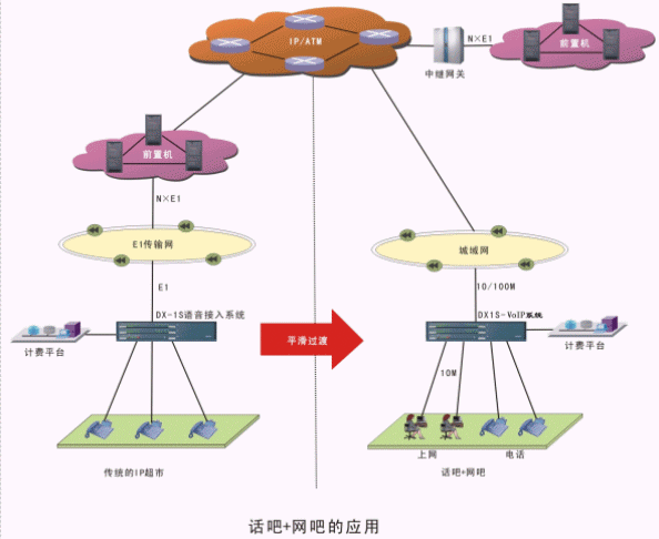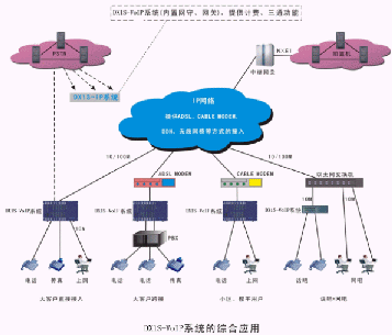 ·當前,網(wǎng)吧如雨后春筍般地在快速建立,DX1S-VoIP系統(tǒng)向下提供10M LAN口及模擬電話接口,可利用已建設(shè)好的寬帶資源,同時架設(shè)IP超市及網(wǎng)吧,資源利用率高,成本低,收效快。
