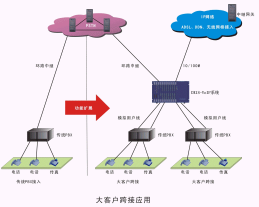 ·DX1S-VoIP系統(tǒng)可在原PBX和IP網(wǎng)間進行跨接,不改變用戶使用電話、傳真的習慣。