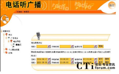 定制自動聽廣播的目的是:用戶設(shè)定的時間到達(dá)時,由系統(tǒng)主動呼叫用戶所定制的電話,用戶摘機(jī)即可收聽到所定制的廣播節(jié)目內(nèi)容。用戶要獲取該自動服務(wù)的前提是,必須預(yù)先定制好外呼時間、外呼電話和廣播內(nèi)容。