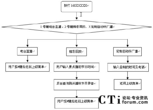 用戶使用時可通過固定話機(jī)、小靈通或手機(jī)撥叫業(yè)務(wù)特號進(jìn)入系統(tǒng),根據(jù)系統(tǒng)的語音提示按鍵選擇收聽不同的電臺節(jié)目,在收聽廣播的過程中,可按下電話機(jī)上的#字鍵返回上級菜單提示音,以滿足用戶在收音過程中需要不斷調(diào)換頻道的要求。