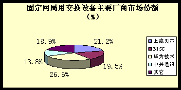 (2)市場特點(diǎn):市場份額進(jìn)一步向業(yè)內(nèi)領(lǐng)先者集中,華為技術(shù)、上海貝爾、BISC 依然保持該領(lǐng)域三甲地位,市場份額占市場總量的67.3%。上述三家廠商各自的市場份額分別占到市場總量的26.6%、21.2%、19.5%。 此外,以中興通訊 、華為技術(shù)為代表的非外資設(shè)備廠商積極開拓國外市場以實現(xiàn)其國際化發(fā)展戰(zhàn)略。 中心城市市場趨于飽和,市場競爭焦點(diǎn)向本地網(wǎng)機(jī)型拆換和中小城市以下市場轉(zhuǎn)移。激烈的價格競爭導(dǎo)致該市場平均利潤微薄。