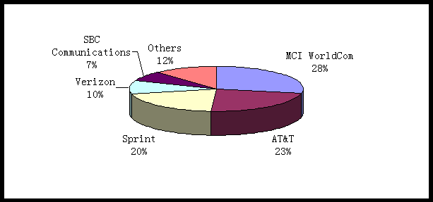 2000年, 美國寬帶互動視頻服務市場中, MCI WorldCom 是最大的贏家,它所占的市場份額約為28%;其次是AT&T 和Sprint,它們的市場份額分別是23%和20%。