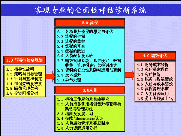 此評(píng)估診斷系統(tǒng)以1.0領(lǐng)導(dǎo)與決策規(guī)劃為起始點(diǎn),作為建立一個(gè)以客戶為核心的高質(zhì)量客戶服務(wù)中心的推動(dòng)根源,并且制定了一個(gè)良好的4.0績效評(píng)估系統(tǒng),以確保經(jīng)營目標(biāo)與標(biāo)準(zhǔn)質(zhì)量基準(zhǔn)能確實(shí)達(dá)成,此過程需透過嚴(yán)謹(jǐn)?shù)牧鞒淘O(shè)計(jì)和高效的人員管理去執(zhí)行這套運(yùn)營體系。