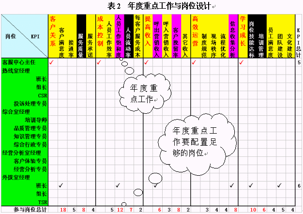 在這里,我們先以崗位設(shè)計來舉例。經(jīng)常有呼叫中心主管把每個崗位的職責(zé)都設(shè)計的非常詳細(xì),包括了每天來做什么,說什么,錄入什么,甚至是打掃某區(qū)域衛(wèi)生之類。但是,我看遍了每一條,也沒找到這個崗位應(yīng)該對什么業(yè)績"負(fù)責(zé)任",該對哪些工作做出貢獻(xiàn)。此處建議各位把效益評價體系、年度重點(diǎn)工作與崗位設(shè)計結(jié)合起來。如表2所示,我們可以把效益評價體系作為KPI放在橫坐標(biāo)中,而崗位設(shè)置則是縱坐標(biāo)。每個崗位對應(yīng)的行中,可以勾畫其應(yīng)負(fù)責(zé)或者做出主要貢獻(xiàn)的項目。這些項目不能超過6個,因為太多的項目會使得這個崗位無所適從,最終的結(jié)果是哪個也沒做好。當(dāng)你勾畫完成之后,請計算每列的"對勾"數(shù)目,看看你本年度的重點(diǎn)工作是不是有較多崗位負(fù)責(zé)呢?