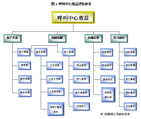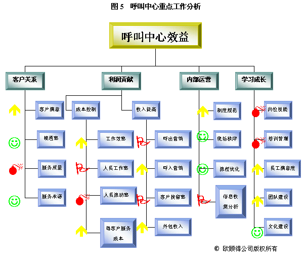 根據(jù)年度重點(diǎn)工作及目標(biāo),我們就可以設(shè)計關(guān)鍵措施來使其實現(xiàn)。通常一項關(guān)鍵措施可以有助于幾個目標(biāo)的達(dá)成。如建立培訓(xùn)體系,可以使得在崗培訓(xùn)、上崗培訓(xùn)、多技能訓(xùn)練以及崗位技能達(dá)標(biāo)率有所提升,而體現(xiàn)在業(yè)務(wù)上的效果則是服務(wù)質(zhì)量的提升、呼出營銷收入增加和客戶挽留率提高。
