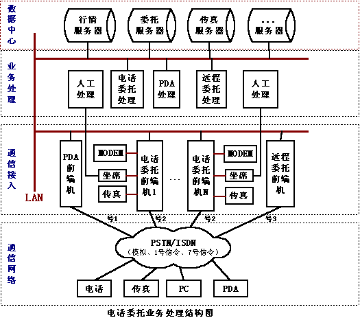 另一種方案是PDA和證券營(yíng)業(yè)部前端機(jī)(實(shí)際就是電話委托前端機(jī))采用FSK通訊方式,使用電話委托的通道來完成所有的委托查詢。這種方式的速度快,信息容量大,保密性強(qiáng),而且營(yíng)業(yè)部不需單獨(dú)申請(qǐng)電話線路,PDA和電話委托線路可動(dòng)態(tài)分配,使其電話線路得到最大限度的利用。另外,營(yíng)業(yè)部對(duì)外形象也好,只用一個(gè)號(hào)碼就可讓股民完成電話委托、PDA委托等多種委托方式,給股民帶來了方便。不過這種方式需要得到電話語音卡提供廠商的產(chǎn)品技術(shù)支持,語音卡必須同時(shí)支持標(biāo)準(zhǔn)的DTMF和FSK的方式,卡上有充足的能力來處理兩種方式,在語音處理卡的底層驅(qū)動(dòng)應(yīng)該將電話和PDA的委托區(qū)別開來,目前市場(chǎng)能夠完全支持這種應(yīng)用的只有深圳市東進(jìn)通訊技術(shù)股份有限公司的產(chǎn)品,東進(jìn)技術(shù)的新一代PCI系列語音卡數(shù)字卡和模擬卡都完全采用DSP(數(shù)字信號(hào)處理器)架構(gòu),卡上有專用DSP來處理DTMF和FSK的收發(fā),是目前PDA委托前端的最好選擇;這種方案還應(yīng)該得到證券電話委托系統(tǒng)的開發(fā)商的支持,在電話委托系統(tǒng)里增加處理PDA委托的功能。目前恒基偉業(yè)的“股靈通”就是采用這種方式。