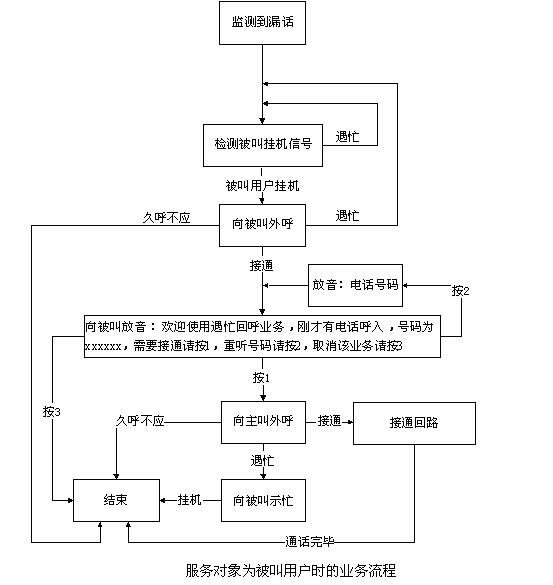 當(dāng)服務(wù)對象是被叫用戶時,產(chǎn)生遇忙漏話后,東進(jìn)漏話監(jiān)測設(shè)備(DMCS)實(shí)時檢測被叫用戶的掛機(jī)信號,如果被叫掛機(jī),則先向被叫外呼,呼出接通后,語音提示“歡迎使用遇忙回呼業(yè)務(wù),剛才有電話呼入,號碼為xxxxxx,需要接通請按1,重聽號碼請按2,取消該業(yè)務(wù)請按3”,如按1,系統(tǒng)向原主叫外呼(亦稱回呼),回呼成功(ACM)后,建立話音回路,進(jìn)一步接續(xù);如回呼原主叫時遇忙(SLB、STB等),則回呼失敗,向被叫用戶示忙。
