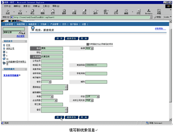 。。比如現(xiàn)在有一個(gè)新客戶黃航的電話13082856110呼入Ebanswers呼叫中心,console控制臺(tái)接收到這個(gè)電話號碼以后,會(huì)產(chǎn)生一個(gè)URL鏈接地址tel=217,以參數(shù)的形式附在調(diào)用的CRM頁面http://ecrm/crm2/default.asp?retURL=http://ecrm/crm2/search/searchtel_xml.asp后面,當(dāng)話務(wù)員登錄以后,就會(huì)彈出相應(yīng)的添加新線索頁面,話務(wù)員填寫好相關(guān)信息后,按下"保存"按鈕就可以建立新線索了。