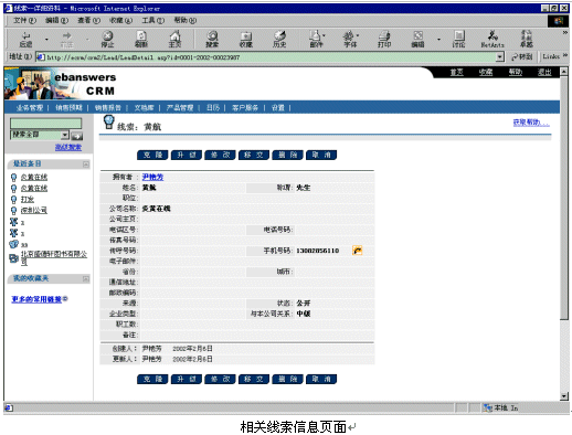 Ebanswers CRM系統(tǒng)去激活相關(guān)客戶資料的IE頁面進(jìn)行處理:如果此號碼數(shù)據(jù)庫中存在,則顯示此人的信息,如果不存在,則顯示CRM中添加新線索的頁面。而Ebanswers