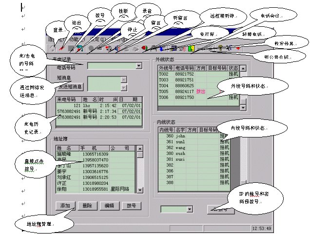電話控制臺(tái)(軟電話),所有系統(tǒng)操作包括電話、查詢、短消息等等都可以通過(guò)鍵盤(pán)、鼠標(biāo)操作完成: