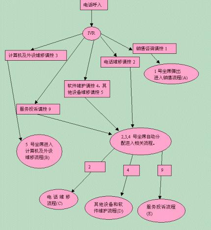 在交互式語(yǔ)音應(yīng)答系統(tǒng)IVR的幫助下,各服務(wù)流程有條不紊地進(jìn)行,每個(gè)職能部門管理自己部門的流程,提供全方位的客戶所要求的服務(wù)。下面我們以銷售咨詢?yōu)槔纯催@個(gè)簡(jiǎn)單的工作流程。