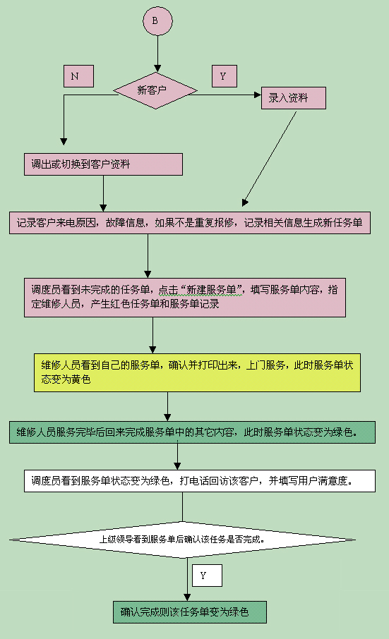 如果是需要上門維修的客戶,點(diǎn)擊"新建任務(wù)單",填寫任務(wù)單上的相關(guān)內(nèi)容,此時(shí)任務(wù)單狀態(tài)為紅色;調(diào)度員看到新任務(wù)單,點(diǎn)擊"新建服務(wù)單",填寫服務(wù)單內(nèi)容,指定維修人員。此時(shí)任務(wù)單狀態(tài)變?yōu)榧t色,服務(wù)單狀態(tài)則為紅色。維修人員看到自己的服務(wù)單,確認(rèn)并打印出來(lái),上門服務(wù),此時(shí)服務(wù)單狀態(tài)變?yōu)辄S色;維修人員服務(wù)完畢后回來(lái)完成服務(wù)單中的其它內(nèi)容,此時(shí)服務(wù)單狀態(tài)變?yōu)樗{(lán)色;調(diào)度員看到服務(wù)單狀態(tài)變?yōu)樗{(lán)色,打電話回訪該客戶,并填寫用戶滿意度;上級(jí)領(lǐng)導(dǎo)看到服務(wù)單后確認(rèn)該任務(wù)是否完成。確認(rèn)完成則該任務(wù)單變?yōu)樗{(lán)色,否則再派出一張服務(wù)單。直到任務(wù)完成。