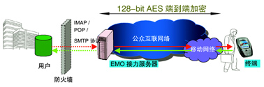 鑒于用戶目前正使用互聯(lián)網(wǎng)郵件系統(tǒng),愛立信提供了EMO Email Push互聯(lián)網(wǎng)版解決方案。方案需要將Email Push應(yīng)用的用戶在愛立信EMO接力服務(wù)器上注冊,同時在用戶的手機上安裝客戶端軟件即可;
