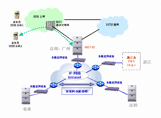 同時(shí),在公司總部, 用愛立信MD110替換原有交換機(jī),并與廣東移動(dòng)直接相連,總部配180個(gè)設(shè)定不同的權(quán)限級(jí)別的ME(移動(dòng)分機(jī)),使經(jīng)常在外辦理業(yè)務(wù)的人員的手機(jī)號(hào)被注冊(cè)為總部交換機(jī)的一個(gè)移動(dòng)分機(jī)。廣東移動(dòng)為所有移動(dòng)分機(jī)提供特殊價(jià)格。
