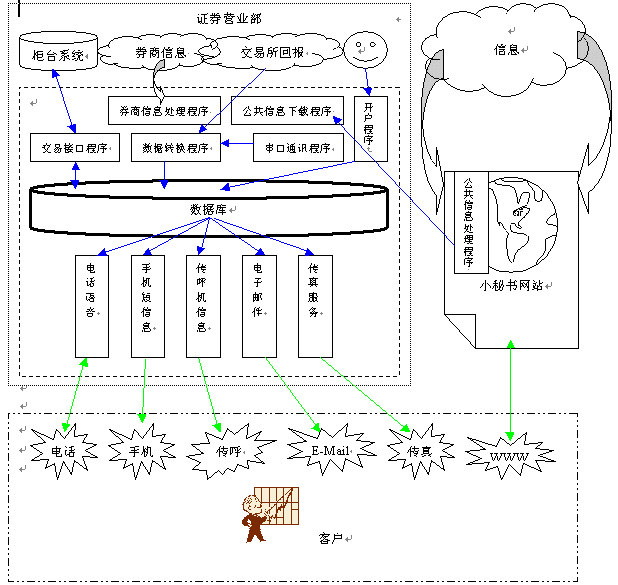 面對(duì)越來(lái)越激烈的競(jìng)爭(zhēng),各個(gè)券商使出渾身解數(shù),推出如透支、手續(xù)費(fèi)返還等各種吸引客戶的手段;運(yùn)用各種各樣的的交易方式如:營(yíng)業(yè)部大戶室、家庭遠(yuǎn)程大戶室、網(wǎng)上交易、電話委托以及手機(jī)炒股、股易通、WAP網(wǎng)上交易等等。然而,這些都屬于被動(dòng)的服務(wù)方式,對(duì)于業(yè)余炒股的大多數(shù)中小戶、散戶來(lái)說(shuō),不可能每天花數(shù)小時(shí)瀏覽股市的各種信息。因此,不知道配股繳款、錯(cuò)過(guò)配售新股等情況時(shí)有發(fā)生,給客戶造成較大的經(jīng)濟(jì)損失;一些重大消息、重大新聞不能及時(shí)獲知,延誤了投資的有利時(shí)機(jī)。據(jù)調(diào)查,目前參加二級(jí)市場(chǎng)配售的投資者比例不足20%。