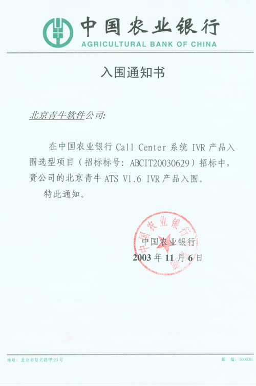 青牛軟件成功入圍中國(guó)農(nóng)業(yè)銀行Call Center產(chǎn)品選型