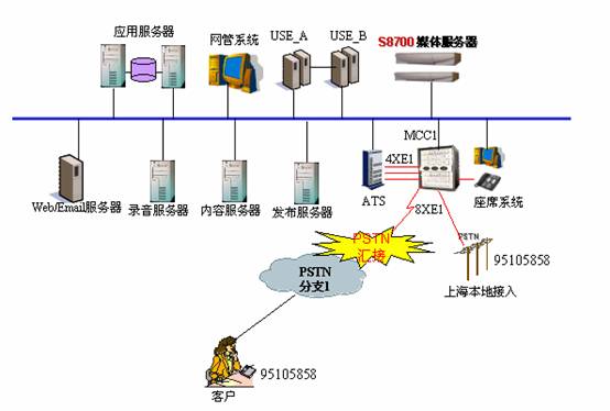1、采用AVAYA的S8700作為排隊(duì)系統(tǒng),MCC1作為媒體網(wǎng)關(guān),全國(guó)280多個(gè)城市的客戶撥打本地電話通過(guò)電信網(wǎng)絡(luò)匯接到上海中心;
