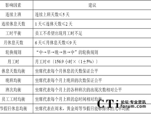 要滿足每半小時(shí)實(shí)際安排的座席數(shù)量不少于需要的座席數(shù)量的要求,首先就需要進(jìn)行班次的設(shè)計(jì),這是為第五環(huán)節(jié)資源規(guī)劃而準(zhǔn)備的。“班次設(shè)計(jì)”是指設(shè)計(jì)出一系列的班次,比如早班,中班,晚班,等等。而將來只要告訴員工,你下個(gè)月每天各上什么樣的班次即可。在班次設(shè)計(jì)時(shí),需要充分考慮前面提到的一些影響因素:如下所示。