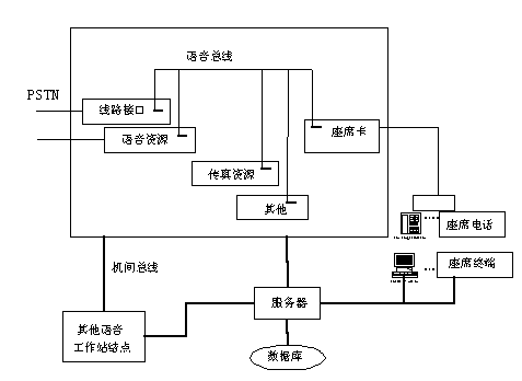 所謂的PC方式就是計算機+語音板卡,即在微機平臺上集成各種功能的資源處理卡,完成通信接口、語音處理、傳真處理、座席轉接等功能,再結合外部的計算機網絡實現(xiàn)各種應用系統(tǒng)的需求。整個系統(tǒng)是一個Client/Server結構的微機網絡。