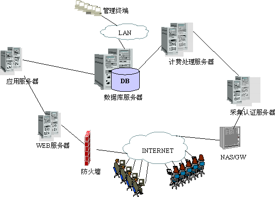 根據(jù)以上體系結(jié)構(gòu),寬帶IP城域網(wǎng)計(jì)費(fèi)與業(yè)務(wù)管理系統(tǒng)的運(yùn)行平臺(tái)結(jié)構(gòu)如圖所示:
