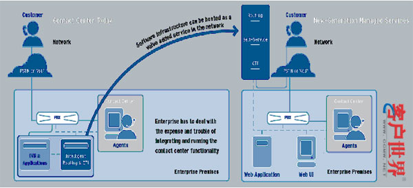 以國(guó)外的托管服務(wù)若建立在800號(hào)于C4/C5局用交換機(jī)上,許多用戶可以不用建制本地的排隊(duì)機(jī)就可以實(shí)現(xiàn)托管服務(wù)。目前國(guó)內(nèi)的運(yùn)營(yíng)商若要直接在C4/C5局用交換機(jī)因?yàn)闆]有C4/C5的CTI服務(wù)器可以連接,所以有其困難的地方,只能采用800號(hào)智能網(wǎng)新增業(yè)務(wù)與本地企業(yè)排隊(duì)機(jī)連網(wǎng)的方式來完成。但國(guó)內(nèi)運(yùn)營(yíng)商未來都會(huì)朝向NGN,采用軟交換的方向來看,企業(yè)可能再也不用采購(gòu)本地排隊(duì)機(jī),對(duì)于呼叫中心托管的業(yè)務(wù)是一個(gè)很好的方向。