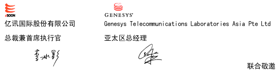 隨著G-Force China 2002的成功舉辦,作為全球CTI第一品牌和客服市場最高占有者的Genesys與其大中國區(qū)專業(yè)總代理eSOON再次攜手, 共同迎來了G-Force China 2003這一盛事。將于10月31日(臺北遠(yuǎn)東飯店)、11月3日(廣州中國大飯店)、 11月5日(上海四季酒店)、以及11月7日(北京中國大飯店)舉辦G-Force China 2003 ── G流而上,決勝千里,大型研討會,預(yù)計總出席人數(shù)逾千人。