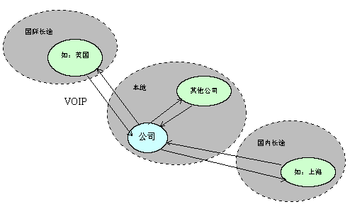 (1) 對于本地其他公司或個人:可以利用VOIP或市話接入公司,再轉(zhuǎn)入國內(nèi)長途或者國際長途。