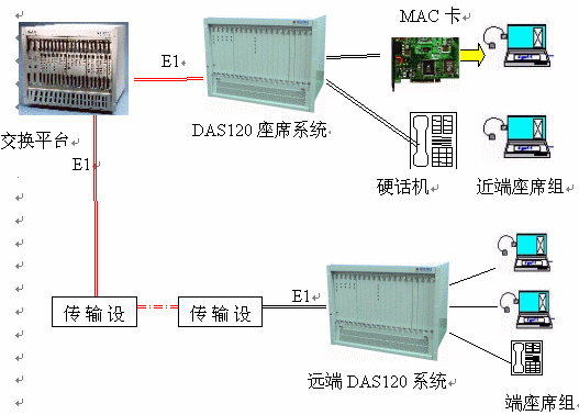 DAS120交換平臺采用1-4個E1連接,可以簡潔實現(xiàn)PCM信號轉(zhuǎn)模擬信號引出到座席。E1接口的信令可選配為隨路信令CAS和透明通道Clear Channel。E1可通過光端機、微波、HDSL等設(shè)備來傳輸,從而實現(xiàn)分布式組網(wǎng)。