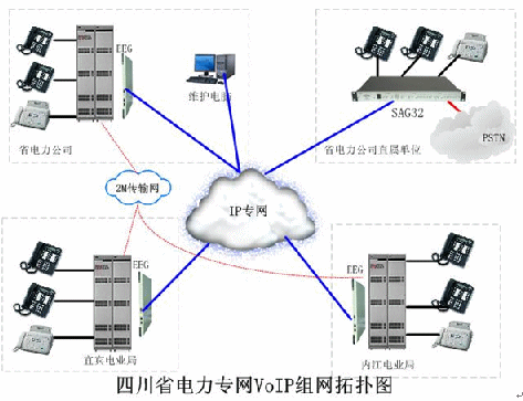 說明:南椏河電廠在現(xiàn)有的IP網(wǎng)絡(luò)基礎(chǔ)上,利用IP中繼網(wǎng)關(guān)EEG與SAG32電信級模擬VoIP網(wǎng)關(guān)實現(xiàn)交換機(jī)的遠(yuǎn)程放號,實現(xiàn)了發(fā)電站與電廠、省電力網(wǎng)、電信等的組網(wǎng),解決了實際的通信問題。在方案中,具有組網(wǎng)簡單,維護(hù)方便,通話質(zhì)量高等特點,得到當(dāng)?shù)赜脩舻恼J(rèn)可。