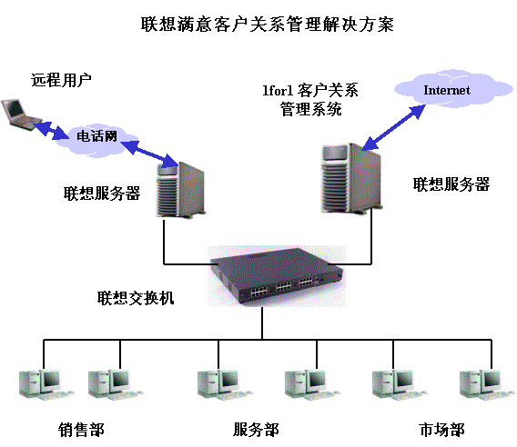 聯(lián)想IT 1for1客戶關(guān)系管理解決方案主要包括以下部分:服務(wù)器端的應(yīng)用軟件采用1for1客戶關(guān)系管理系統(tǒng);服務(wù)器端采用聯(lián)想萬全工作組級(jí)和部門級(jí)服務(wù)器;客戶端推薦采用中高端商用電腦。