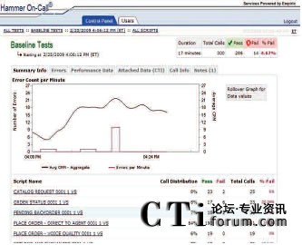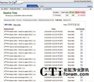 只需使用一個簡單易用的Web接入就可以和Empirix測試小組一起實時跟蹤測試進度。此外,還同時可以查看測試結果、發(fā)生失敗的類型和導致失敗發(fā)生的測試流量。通話全程記錄功能可以用來記錄相關通話,從而捕獲和幫助診斷發(fā)生失敗的根源。可以參考下列圖表: