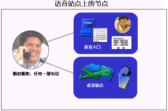 在語音網(wǎng)上,內容和服務將會以兩種方式出現(xiàn)即個人語音站點和語音入口。語音入口和語音站點都屬于網(wǎng)絡上的節(jié)點,這兩者由一個標準的語音瀏覽器連接起來,關于這部分內容,將在以后進行描述。