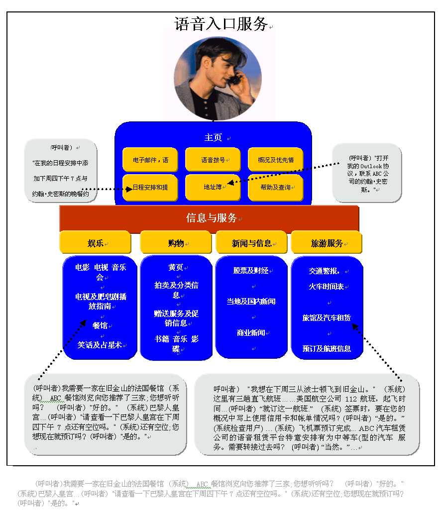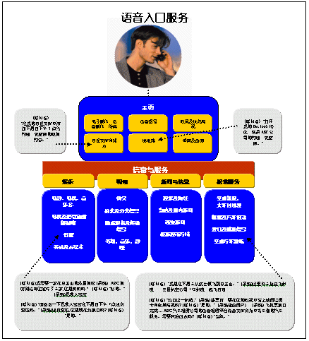 語音網(wǎng)最吸引人之處就在于它可以在一次通話中,同時處理多個任務。下圖表明一名商務人員是如何安排好與一個未來的商務旅行有關的一系列任務的。他獲取了對自己有用的信息,順利達成了一項語音商務交易,接收個人信息和辦公室的幫助,并撥打電話所有這些都是在一個同步過程中完成的。