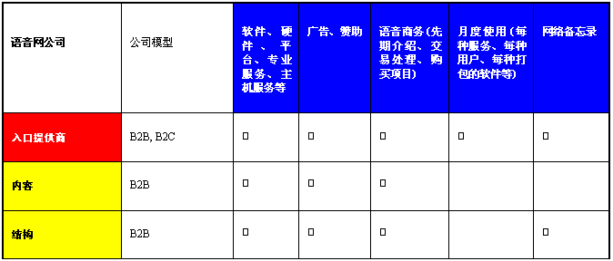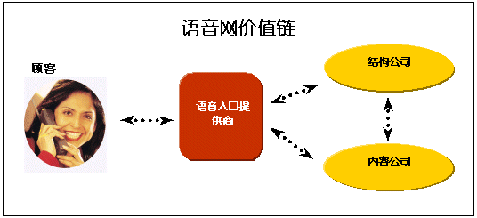 許多語音入口提供商向個人和公司提供語音網(wǎng)上的服務,而內容和結構公司則向這些入口提供商提供技術支持、產品和主機服務。