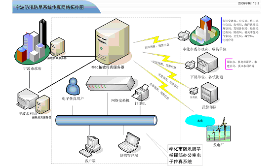 如拓樸圖所標(biāo),寧波市政府、寧波水利局與奉化市三防辦均采用了加拿大Eicon 公司與拓敏聯(lián)合推出的傳真服務(wù)器系統(tǒng),可進(jìn)行針對需求的智能設(shè)定傳真發(fā)送。