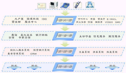 證券客戶服務系統面向用戶提供電話、傳真、網絡等方式的咨詢、查詢、委托、銀行轉帳、自動業(yè)務等業(yè)務功能。系統以提供“個性化、社會化、信息化”服務為重要特征,具有“滿足未來業(yè)務發(fā)展需要”、“滿足實時處理”的能力。系統在設計、實現上,以具有先進技術和高穩(wěn)定性的呼叫中心平臺為基礎,竭力為證券業(yè)務運營商建立一個強大、開放、靈活的業(yè)務服務系統,更好地滿足證券用戶日益增長的各種新的服務需求,保持證券企業(yè)在市場競爭中的優(yōu)勢。