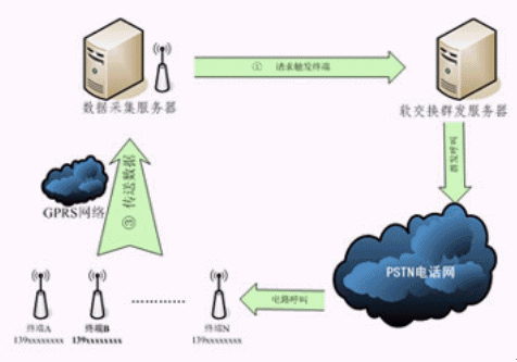 1X數(shù)據(jù)網(wǎng)絡(luò)的遠(yuǎn)端模塊,用來(lái)傳輸設(shè)備的運(yùn)行參數(shù),這種設(shè)備數(shù)量多至上萬(wàn)個(gè)。由于GPRS或CDMA1X實(shí)時(shí)在線傳輸費(fèi)用過(guò)于昂貴,因此設(shè)備數(shù)據(jù)采集需要每天定時(shí)有喚醒激活機(jī)制。采用軟交換的群發(fā)呼叫功能,可以定時(shí)大容量地呼叫GPRS或CDMA1X所在位置各手機(jī)號(hào)碼,以產(chǎn)生的鈴流來(lái)觸發(fā)遠(yuǎn)程設(shè)備啟動(dòng)GPRS或CDMA1X并傳輸數(shù)據(jù),確保遠(yuǎn)程設(shè)備的正常運(yùn)作。