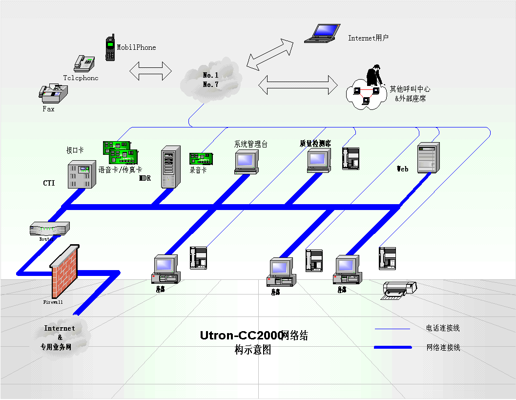 。。Utron-CC2000電信客戶服務(wù)中心系統(tǒng),支持傳統(tǒng)電話、傳真、電子郵件、Web等多種媒體呼叫接入,提供多種特服業(yè)務(wù)(112、114、170、180、189等)的綜合受理,從而實(shí)現(xiàn)電信客戶服務(wù)中心的基本建設(shè)目標(biāo):