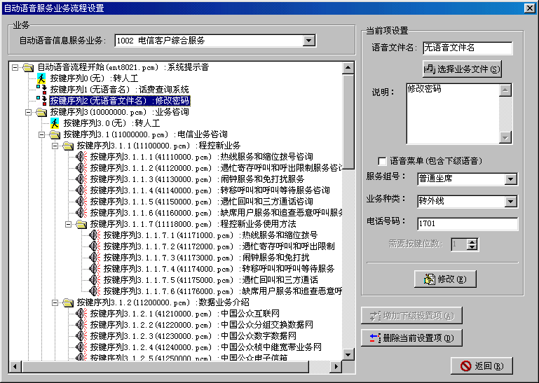 。。智能業(yè)務(wù)管理系統(tǒng)是Utron-CC2000進(jìn)行業(yè)務(wù)擴(kuò)充的主要手段。用戶如需擴(kuò)展新的業(yè)務(wù),主要通過智能業(yè)務(wù)管理系統(tǒng)向Utron-CC2000注冊(cè)該業(yè)務(wù);并為系統(tǒng)中的座席分配業(yè)務(wù)。根據(jù)實(shí)際業(yè)務(wù)的需求,生成相應(yīng)的系統(tǒng)信箱、業(yè)務(wù)腳本、服務(wù)項(xiàng)目等,來實(shí)現(xiàn)新業(yè)務(wù)的動(dòng)態(tài)加載。