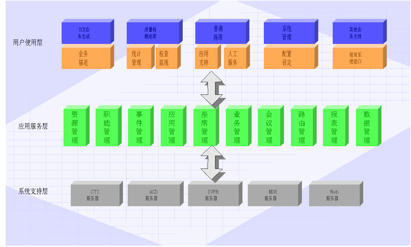 由客戶呼入組件、服務(wù)項(xiàng)目管理組件、座席管理組件、資源管理組件等多個(gè)組件共同搭建。