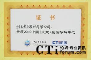 CTI論壇(ctiforum)10月14日消息(記者 潘婷婷):2010年9月28日,恒生通信應(yīng)邀出席由中國電子商會呼叫中心與客戶關(guān)系管理專業(yè)委員會(CNCCA)主辦,國家工業(yè)和信息化部支持,CTI論壇承辦的2010中國呼叫中心產(chǎn)業(yè)峰會。憑借在中國呼叫中心領(lǐng)域技術(shù)及市場的領(lǐng)先地位,恒生通信榮獲中國電大會組委會頒發(fā)的中國(亞太)最佳呼叫中心供應(yīng)商大獎。這已是恒生通信自2007年來連續(xù)第四年獲此殊榮。