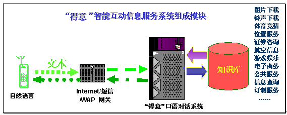 在現(xiàn)有的數(shù)據(jù)通信和信息服務(wù)的技術(shù)平臺(tái)上,加入"得意口語(yǔ)對(duì)話系統(tǒng)運(yùn)行平臺(tái)",就能夠讓用戶在通過Internet/SMS/WAP等各種通信手段,在電腦、手機(jī)等設(shè)備上以自然語(yǔ)言的形式享受相關(guān)領(lǐng)域的智能互動(dòng)信息服務(wù)。