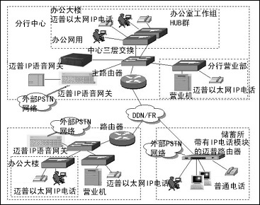 分行中心與下面的支行以及各儲(chǔ)蓄網(wǎng)點(diǎn)根據(jù)業(yè)務(wù)應(yīng)用需求出發(fā),可以利用邁普各系列路由器產(chǎn)品,通過(guò)DDN或者幀中繼把分行辦公大樓和營(yíng)業(yè)部、支行辦公大樓和營(yíng)業(yè)部、分行和支行下屬儲(chǔ)蓄所連起來(lái)。對(duì)于分行中心以及下面的支行,由于網(wǎng)絡(luò)結(jié)構(gòu)比較復(fù)雜,再加上網(wǎng)絡(luò)基礎(chǔ)設(shè)施建設(shè)已經(jīng)很完善,一般可以采用邁普IP語(yǔ)音網(wǎng)關(guān),通過(guò)它與原有的外部PSTN網(wǎng)絡(luò)相連。而對(duì)于一些較小的儲(chǔ)蓄網(wǎng)點(diǎn),則可以通過(guò)采用帶有IP電話(huà)模塊的邁普路由器。邁普路由器的IP電話(huà)模塊可與電話(huà)機(jī)或交換機(jī)相連,能夠支持G.711、G.723、G.729等多種語(yǔ)音壓縮算法,并且還支持H.323協(xié)議,實(shí)現(xiàn)IP電話(huà)功能。