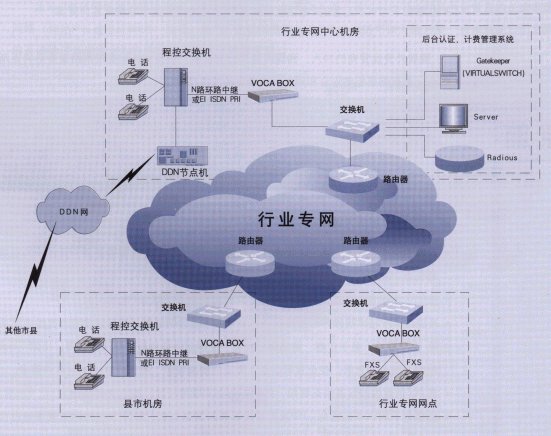 中心并設立一級計費認證及結(jié)算中心、網(wǎng)絡管理中心(VBMS),對網(wǎng)內(nèi)電話集中管理和計費。通過在各地市機構(gòu)原有的內(nèi)部網(wǎng)絡基礎上增加數(shù)臺VOCABOX實現(xiàn)語音終端接入,并在地市機構(gòu)通過帶FXO接口的VOCABOX實現(xiàn)內(nèi)部IP電話與內(nèi)部電話網(wǎng)絡的呼叫轉(zhuǎn)接,網(wǎng)絡拓撲連接如下圖所示