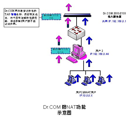 共享合法用戶的身份的NAT用戶,由于他們發(fā)出的數(shù)據(jù)包是沒有經(jīng)過(guò)封裝的,雖然經(jīng)過(guò)合法用戶的電腦實(shí)現(xiàn)了地址轉(zhuǎn)換,但Dr.COM的防代理客戶端不會(huì)對(duì)這些NAT用戶的數(shù)據(jù)包進(jìn)行封裝,所以這些數(shù)據(jù)包就在網(wǎng)關(guān)被過(guò)濾掉,代理用戶就不能正常上網(wǎng)。