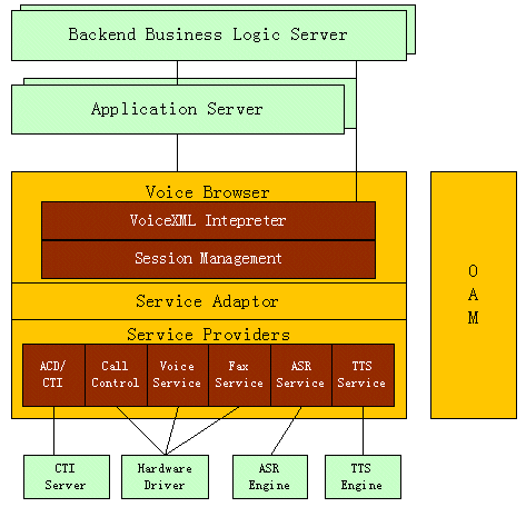 用于存放和產(chǎn)生VoiceXML腳本,可以是文件系統(tǒng)或WEB服務(wù)器,一般文件系統(tǒng)應(yīng)用于靜態(tài)腳本,WEB服務(wù)器應(yīng)用于動態(tài)腳本;應(yīng)用邏輯組件或中間件,進(jìn)行事務(wù)處理。