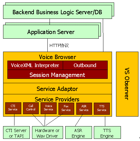 用于存放和產(chǎn)生VoiceXML腳本,可以是文件系統(tǒng)或WEB服務(wù)器,一般文件系統(tǒng)應(yīng)用于靜態(tài)腳本,WEB服務(wù)器應(yīng)用于動(dòng)態(tài)腳本;應(yīng)用邏輯組件或中間件,進(jìn)行事務(wù)處理。